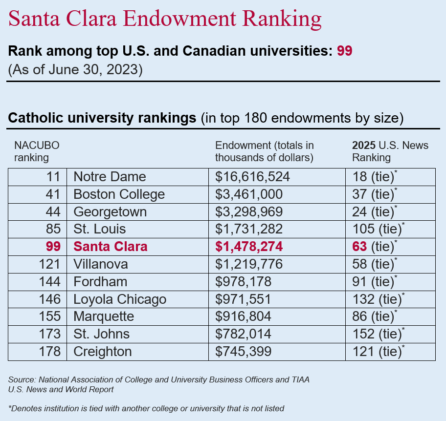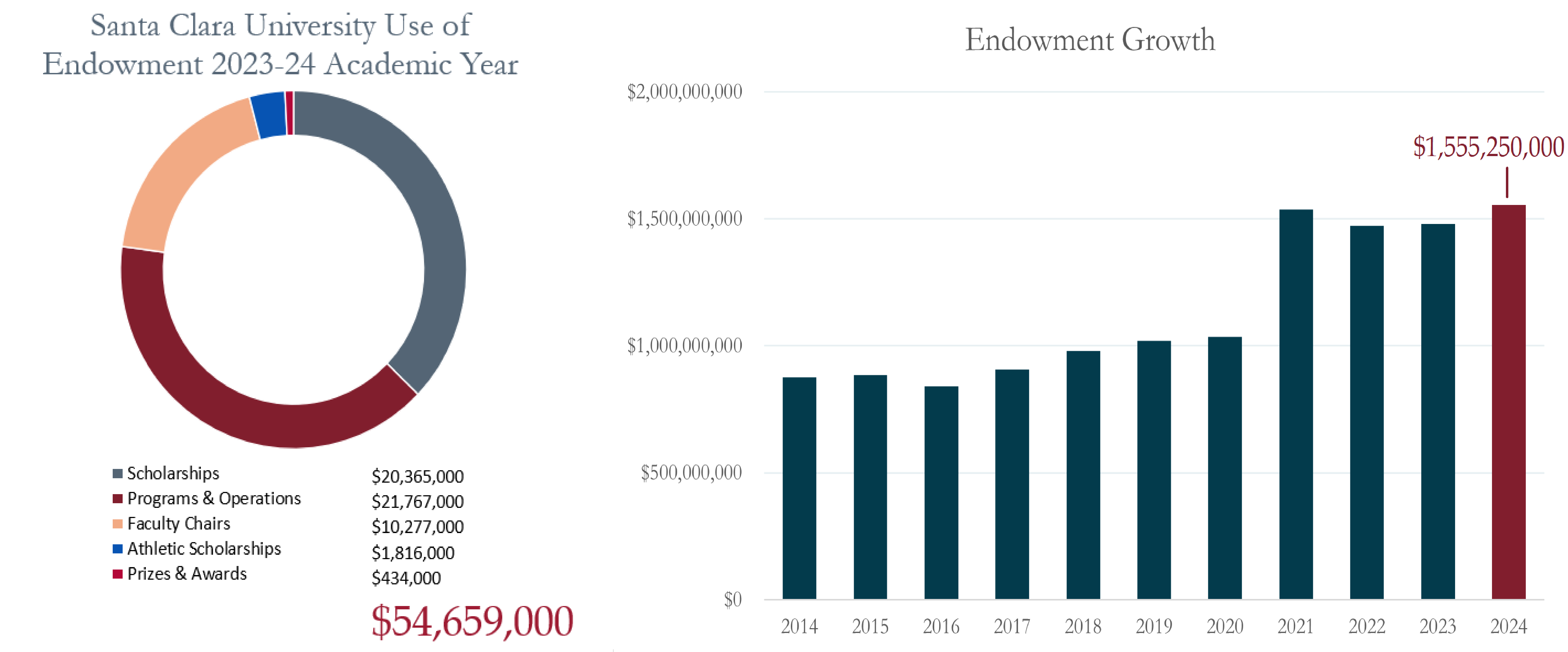 Underlying the endowment are over 1,000 donor designated pools, each contributing in a unique way to help Santa Clara deliver a world-class Jesuit education. The largest designations include merit and need-based scholarships, funding for a variety of university programs and endowed chairs to attract prominent faculty. Every year, the university liquidates approximately 4.5% of the portfolio and contributes the proceeds to fund current operations. In fiscal 2024, this has equated to $55 million or 9% of the university’s operating budget.